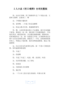 122人人小品《有口难辨》台词完整版小品《有口难辨》台词完整版男:这自行车啊,冒了泡推着车走了十里盘山道,又累呀又饿呀,总算到了,嘿女:干啥像小偷似的男:老伴啊,二半夜了你还没睡啊女:你这么晚才回来...