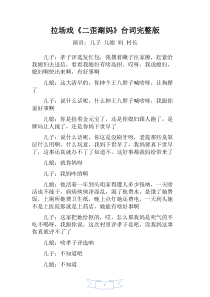 1拉场戏《二歪涮妈》台词完整版拉场戏《二歪涮妈》台词完整版演员:儿子儿媳妈村长儿子:孝子评选发红包,我撂着蹶子往家撩,赶紧给我媳妇去送信,看看我媳妇有啥高招。哎呀,我说媳妇,媳妇啊快出来啊,有好事啊...