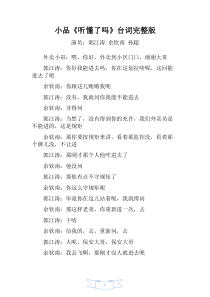 1小品《听懂了吗》小品《听懂了吗》台词完整版台词完整版演员:郭江涛余钦南孙超外卖小哥:喂,你好,外卖到小区门口,谢谢大哥郭江涛:你好我能进去吗,你在这划拉啥呢,这回能进去了吧余钦南:你跟这儿贿赂我呢...